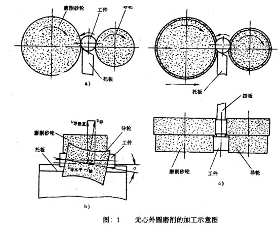 無心外圓磨床是一種特殊的外圓磨床。在無心處圓磨床上磨削工件外圓時,工件不用頂尖來定心和支承,而是直接將工件放在砂輪子和導輪子之間,由托板支承,工件被磨削的外圓面作定位面,如圖1所示。
