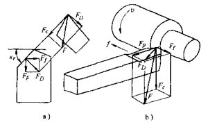 (1) 切削力的產(chǎn)生與切削力的分解 切削加工時(shí),在刀具的作用下,被切削層金屬、切屑和工件已加工表面金屬都要產(chǎn)生彈性變形和塑性變形,這些變形所產(chǎn)生的抗力分別作用在前刀面和后刀面上:同時(shí),由于切屑沿前刀面流出,刀具與工件之間有相對(duì)運(yùn)動(dòng),所以還有摩擦力作用在刀面和后刀面上。這些作用在刀具上的合力就是總切削力F,簡(jiǎn)稱切削力。