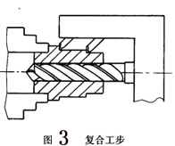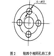 如圖2所示零件,連續(xù)鉆四φ15mm的孔,可看作一個工步鉆4孔φ15mm,以簡化工藝文件,另一種情況,有時為了提高生產(chǎn)率,用向把不同刀具,同時加工幾個不同表面,如圖3,也可看作一個工步,稱為復合工步。