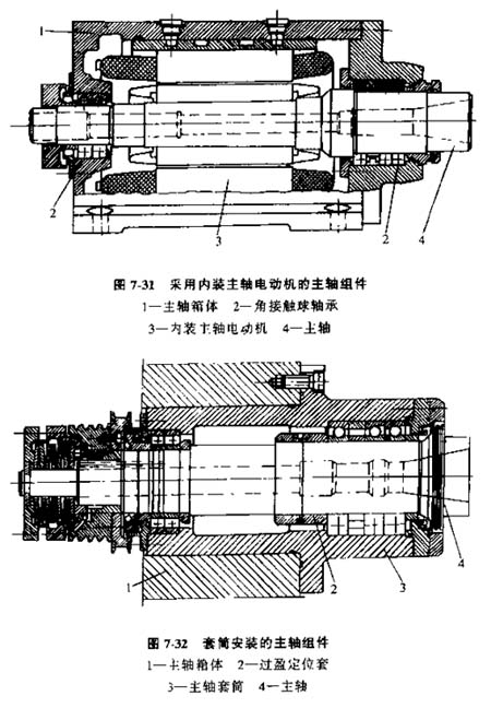 圖7-31所示是一種采用內(nèi)裝主軸電動(dòng)機(jī)的主軸組件(圖中為示出裝卸刀具及刀具夾緊機(jī)構(gòu)),簡(jiǎn)化了主傳動(dòng)系統(tǒng)。圖7-32和圖7-33為用套筒安裝的主軸組件,這類(lèi)主軸組件主軸支承跨距可以較短,主軸傳動(dòng)件位于主軸后部。