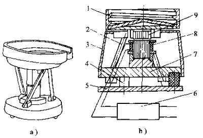 (1) 振動(dòng)式料斗的運(yùn)動(dòng)特點(diǎn)圖60-1的振動(dòng)式料斗由電磁力作為驅(qū)動(dòng)力。當(dāng)電磁達(dá)到最大值時(shí),街鐵9被吸下,帶動(dòng)料斗1,同時(shí)三片沿圓周方向分布的彈簧2變形。電磁力消失時(shí)街鐵放開,彈簧復(fù)原。彈簧的變形,復(fù)原過程中,料斗1既作上下運(yùn)動(dòng),又作扭轉(zhuǎn)運(yùn)動(dòng),使零件從低部沿螺旋軌道上升,在料斗內(nèi)座上布置的定向裝置對零件作定向整理。正確定向的零件從料斗上部的出料口進(jìn)入輸聊管道。