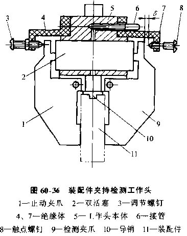 2) 裝配件夾持檢測工作頭,圖30-36所示工作頭根據(jù)夾持動作發(fā)出的信號,壓縮空氣進(jìn)入接管6,推動雙活塞2,使止動夾爪1及檢測夾爪9閉合,開始夾持裝配件11。正常夾持時在夾爪9與觸點螺釘8之間形成間隙δ,兩者之間斷路。夾持失誤時間隙消失,夾爪9與螺釘8之間形成通路,通過控制回路發(fā)出報警信號。