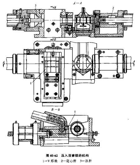 壓入活塞機(jī)構(gòu);在活塞被送到與連桿、活塞銷裝配的工位后,活塞銷也被送到位,然后將活塞銷壓入。見圖60-62。活塞銷的送進(jìn)用專用裝置實(shí)現(xiàn),利用直角V形塊1夾住活塞銷,并使銷沿導(dǎo)軌移到其軸線與定心桿2和壓桿3的軸線重合的位置。在壓入活塞銷前;钊c連桿一起用定心桿2同時(shí)定向;壓入活塞銷后,定心桿2被壓桿3擠出來(lái),在工位1上裝配好的一套連桿活塞被提升上去,再由步距桿式運(yùn)輸器用擺桿運(yùn)向下一個(gè)裝配區(qū)。
