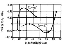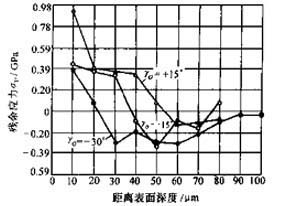 1) 刀具方面,當前角由正值逐漸變?yōu)樨撝禃r,表層的殘余拉應(yīng)力逐漸減小,但殘余應(yīng)力層的深度增大(見圖3-5)在一定的切削用量下,采用絕對值較大的負前角,可使已加工表面層得到殘余壓應(yīng)力(見圖3-6)
