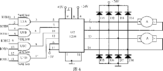 圖4為采用內(nèi)部集成有兩個(gè)橋式電路的專用芯片L298所組成的電機(jī)驅(qū)動(dòng)電路。驅(qū)動(dòng)芯片L298是驅(qū)動(dòng)二相和四相步進(jìn)電機(jī)的專用芯片,我們利用它內(nèi)部的橋式電路來(lái)驅(qū)動(dòng)直流電機(jī),這種方法有一系列的優(yōu)點(diǎn)。每一組PWM波用來(lái)控制一個(gè)電機(jī)的速度,而另外兩個(gè)I/O口可以控制電機(jī)的正反轉(zhuǎn),控制比較簡(jiǎn)單,電路也很簡(jiǎn)單,一個(gè)芯片內(nèi)包含有8個(gè)功率管,這樣簡(jiǎn)化了電路的復(fù)雜性,如圖所示IOB10、IOB11控制第一個(gè)電機(jī)的方向,IOB8輸入的PWM控制第一個(gè)電機(jī)的速度;IOB12、IOB13控制第二個(gè)電機(jī)的方向,IOB9輸入的PWM控制第二個(gè)電機(jī)的速度。