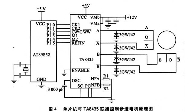 圖4是單片機(jī)與TA8435相連控制步進(jìn)電機(jī)的原理圖。引腳M1和M2決定電機(jī)的轉(zhuǎn)動(dòng)方式:MI=0、M2=O,電機(jī)按整步方式運(yùn)轉(zhuǎn);Ml=1、M2=0,電機(jī)按半步方式運(yùn)轉(zhuǎn);M1=O、M2=1,電機(jī)按1/4細(xì)分方式運(yùn)轉(zhuǎn);Ml=1、M2=1,電機(jī)按l/8步細(xì)分方式運(yùn)轉(zhuǎn)。CW/CWW控制電機(jī)轉(zhuǎn)動(dòng)方向,CKl、CK2時(shí)鐘輸入的最大頻率不能超過5 kHz?刂茣r(shí)鐘的頻率,即可控制電機(jī)轉(zhuǎn)動(dòng)速率。REFIN為高電平時(shí),NFA和NFB的輸出電壓為0.8 V,REFIN為低電平時(shí),NFA和NFB輸出電壓為0.5 V,這2個(gè)引腳控制步進(jìn)電機(jī)輸入電流,電流大小與NF端外接電阻關(guān)系式為:,Io=Vref/Rnf。圖4中,設(shè)REFIN=l,選用步進(jìn)電機(jī)額定電流為0.4 A,Rl、R2選用1.6 Ω、2W的大功率電阻,O、C兩線不接。步進(jìn)電機(jī)按二相雙極性使用,四相按二相使用時(shí)可以提高步進(jìn)電機(jī)的輸出轉(zhuǎn)矩。D1~D4快恢復(fù)二極管用來泄放繞組電流。
