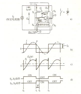 現(xiàn)在,使開關(guān)S1、S2導(dǎo)通,由直流電壓源Ed沿圖a中①路線供給負(fù)載電流i。在時(shí)刻t1使這兩個(gè)開關(guān)關(guān)斷,同時(shí)使開關(guān)S3、S4導(dǎo)通,于是負(fù)載的無功功率就沿②路線反饋給直流電壓源Ed。
