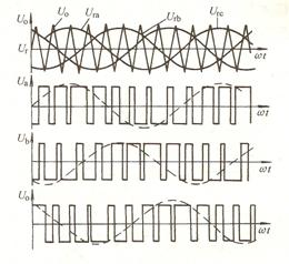 2.雙極性調(diào)制 上述單極性脈寬調(diào)制,脈沖的極性不改變,要正、負(fù)半周輸出不同極性的脈沖,必須另加倒相電路。與此相對(duì)應(yīng),若在調(diào)制過程中,載頻信號(hào)和參考信號(hào)的極性交替地不斷改變則稱為雙極性調(diào)制。其調(diào)制波形如圖10所示,圖中畫出三相調(diào)制波形。與上述單極性SPWM的情況相同,輸出電壓的大小和頻率也是由改變正弦參考信號(hào)Ur的幅值大小和頻率調(diào)制的。參考信號(hào)也可以采用階梯式準(zhǔn)正弦波。