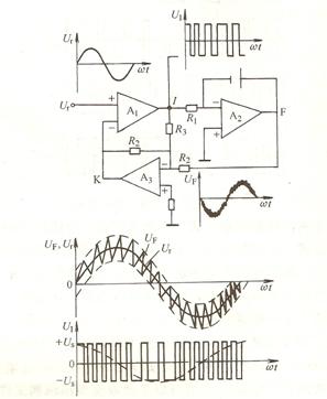 “Δ”脈寬調(diào)制電路的基本工作原理:正弦波參考信號(hào)電壓Ur加在運(yùn)算放大器A1的同相輸入端,A1作為比較器工作。當(dāng)Ur從零上升時(shí),A1的輸出電壓U1迅速升到正飽和值Us,+Us電壓經(jīng)運(yùn)算放大器A2作反向積分,其輸出電壓UF負(fù)向線性增長,UF和+U1經(jīng)R2、R3綜合加到運(yùn)算放大器A3的反相輸入端,R3>R2,A3輸出正向上升電壓UK,UK與Ur在運(yùn)算放大器A1中相比較,當(dāng)UK< SPAN>r時(shí),A1輸出保持+Us,一旦UK上升到UK>Ur時(shí),A1迅速翻轉(zhuǎn)輸出負(fù)飽和電壓-Us。-Us電壓再經(jīng)運(yùn)算放大器A2反向積分,使其輸出UF負(fù)值線性減小,從而使A3的輸出電壓UK也隨之減小,當(dāng)UK< SPAN>r時(shí),U1又轉(zhuǎn)換為+Us,UF負(fù)值又增大,UK再次上升,如此循環(huán)不已,便得到圖11所示的“Δ”脈寬調(diào)制波形。