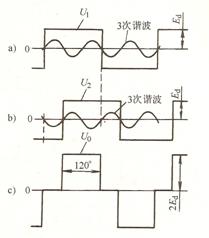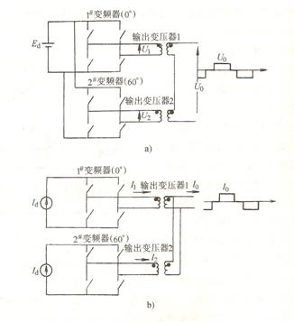 如果將相位差為60º的兩臺(tái)單相變頻器的輸出U1、U2圖12a與圖b合成,則合成輸出的導(dǎo)通寬度為120º。U1、U2所含的3次諧波相位相差180º,在輸出中被互相抵消。這就叫作多重化。這種多臺(tái)變頻器的多重化可以抵消諧波,改善波形;輸出為兩臺(tái)變頻器之和,容易實(shí)現(xiàn)大容量化。