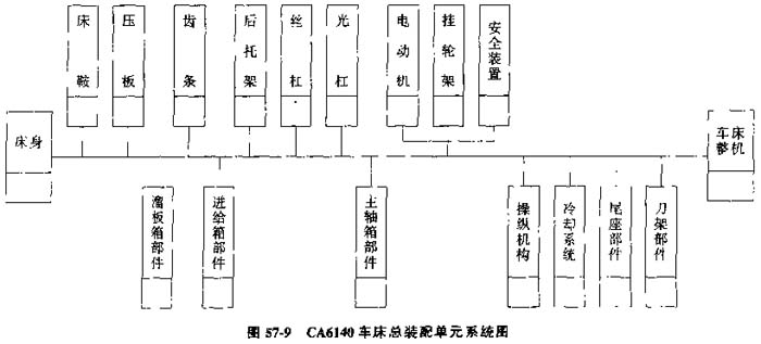 裝配單元系統(tǒng)圖(圖57-9)直觀地表示出產(chǎn)品的劃分及其裝配順序。習(xí)慣上先繪出一條永橫線,在橫線的左端繪出代表基準(zhǔn)件的長方格,右端繪出代表產(chǎn)品的長方格。圖中每一零、部件都用長方格表示,方格中可以注明裝配單元的名稱、數(shù)量和編號。將零件繪在橫線上面,部件繪在橫線下面。