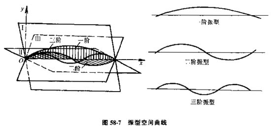 (1)撓性轉(zhuǎn)子動(dòng)平衡原理,將撓性轉(zhuǎn)子簡化為一根簡支梁,梁在其彈性穩(wěn)定平衡位置附近會(huì)發(fā)生多種形式的微小振動(dòng),其中橫向振動(dòng)是撓性轉(zhuǎn)子動(dòng)平衡的理論基礎(chǔ),整個(gè)轉(zhuǎn)子的振動(dòng)位移,即動(dòng)撓度曲線上一條繞如圖58-7所示的轉(zhuǎn)軸Oz,以角速度w回轉(zhuǎn)的空間曲線,可以視該曲線為無限多條固有頻率不同的振型曲線在空間疊加而成。各階振型曲線所在平面互不重合,圖58-7所示為三個(gè)振型的空間曲線。