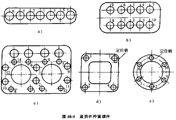 3)同一零件用多個螺釘或螺栓緊固時,各螺釘或螺栓需按一定順序逐步擰緊,如有定位銷,應(yīng)從靠近定位銷的螺釘或螺栓開始,見圖58-9。