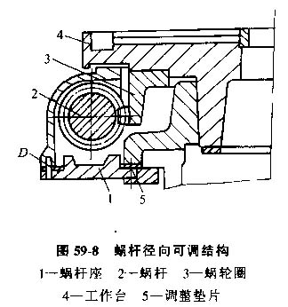 實(shí)現(xiàn)側(cè)隙調(diào)整可用徑向調(diào)或軸向可調(diào)結(jié)構(gòu),蝸桿徑向可調(diào)結(jié)構(gòu)見(jiàn)圖59-8。這種蝸桿傳動(dòng)的加工工藝一般是:待蝸輪圈3裝合在刮研好的工作臺(tái)4上精加工無(wú)論癡面后,按齒面接觸斑點(diǎn)分布狀況,配磨蝸桿2的齒面。在檢驗(yàn)機(jī)上按一定的中心距,檢查蝸輪齒面接觸斑點(diǎn),確保在規(guī)定的嚙合側(cè)隙情況下達(dá)到正常接觸,然后進(jìn)行裝配。裝配時(shí),先刮研蝸桿座1的裝配基準(zhǔn)D,并保證蝸桿座上裝蝸桿的軸承孔的軸線對(duì)D面的平行度精度。配磨調(diào)整墊片5,以保證蝸桿軸線位于蝸輪齒的中央截面內(nèi)。同時(shí)徑向微調(diào)蝸桿座,達(dá)到規(guī)定的接觸斑點(diǎn)后,配鉆、鉸蝸桿座與底座的定位銷(xiāo)孔,裝上定位銷(xiāo),擰緊螺釘。