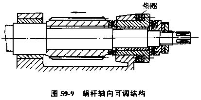 蝸桿軸向可調(diào)結(jié)構(gòu)見(jiàn)圖59-9。這種結(jié)構(gòu)的蝸桿必須是變齒厚蝸桿,即蝸桿兩側(cè)螺旋面的導(dǎo)怔不同。這種蝸桿傳動(dòng)容易調(diào)整側(cè)隙,且調(diào)整時(shí)不改變中心距離,從而不改變接觸精度和運(yùn)動(dòng)精度。根據(jù)保證側(cè)隙所要求的修配量,將墊圈1磨薄,使蝸桿的厚齒端向圖示箭頭方向移動(dòng)一個(gè)相應(yīng)的量即可。
