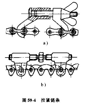 當(dāng)兩輪中心距離可調(diào)且鏈輪在軸端時(shí),可以將鏈條兩端預(yù)先接好,再裝到鏈輪上,如果受結(jié)構(gòu)限制,只能先將鏈條套在鏈輪上再進(jìn)行連接,此時(shí)可以采用專用的拉緊工具,見圖59-4。