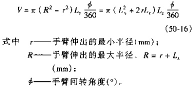 3) 球坐標(biāo)式,如圖50-71c所示,手臂運(yùn)動(dòng)由直線運(yùn)動(dòng)x和兩個(gè)擾y、z的運(yùn)動(dòng)組成,其空間作業(yè)范圍為空心球體的一部分,可用下式表示: