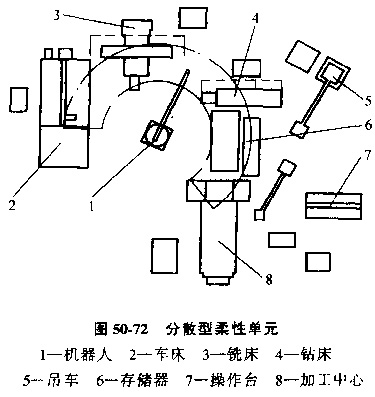 固定式機(jī)器人可分成服務(wù)于多臺(tái)機(jī)床式和服務(wù)于固定機(jī)床式兩種。圖50-72所示是采用一臺(tái)機(jī)器人把工件供給數(shù)臺(tái)機(jī)床的示例,著種柔性制造單元是以機(jī)器人為核心的系統(tǒng)結(jié)構(gòu)。各臺(tái)機(jī)床的工件裝卸位置分布在機(jī)器人的可活動(dòng)范圍內(nèi),機(jī)器人按控制成粗實(shí)現(xiàn)各臺(tái)機(jī)床的工件裝卸及傳遞。