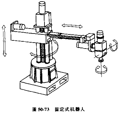 4) 關(guān)節(jié)式,如圖50-71d所示,手臂運(yùn)動(dòng)由三個(gè)回轉(zhuǎn)運(yùn)動(dòng)組成,其空間作業(yè)范圍為多圓狐疊合球體。