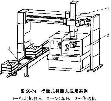 行走式機(jī)器人即移動(dòng)式機(jī)器人,普通自動(dòng)裝卸機(jī)處理工件功能的柔性較小,但隨著對(duì)這些功能柔性要求的提高,將自動(dòng)裝卸機(jī)處理工件的功能轉(zhuǎn)變?yōu)闄C(jī)器人的臂和手的形態(tài),就形成了行走式機(jī)器人。圖50-74是行走式機(jī)器人的例子。采用了機(jī)器人與傳送機(jī)及運(yùn)輸小車的組合輸送方式。