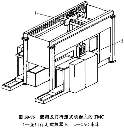 如果將單軌改為兩條導(dǎo)軌,則成為橋式起重機(jī),或龍門式起重機(jī),在柔性制造系統(tǒng)中也使用以這些起重機(jī)為基礎(chǔ)的行走式機(jī)器人,圖50-75所示的是德國(guó)柏林工業(yè)大學(xué)使用龍門行走式機(jī)器人的柔性制造單元,它的手部位可自動(dòng)交換,不僅對(duì)工件,而且對(duì)刀具、量規(guī)和夾具進(jìn)行搬運(yùn)與操作處理。這種龍門行走式機(jī)器人結(jié)構(gòu)堅(jiān)固,可實(shí)現(xiàn)高精度定位。
