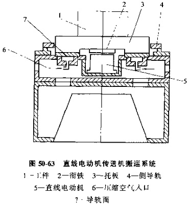 圖50-63是用于組成柔性制造系統(tǒng)的直線電動機傳送機,在這一輸送系統(tǒng)中,托盤在空氣靜壓導軌上運行,直線電動機設(shè)置在中部,銜鐵設(shè)置在托板下方。