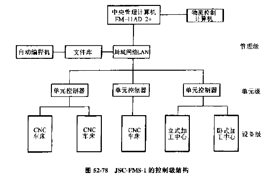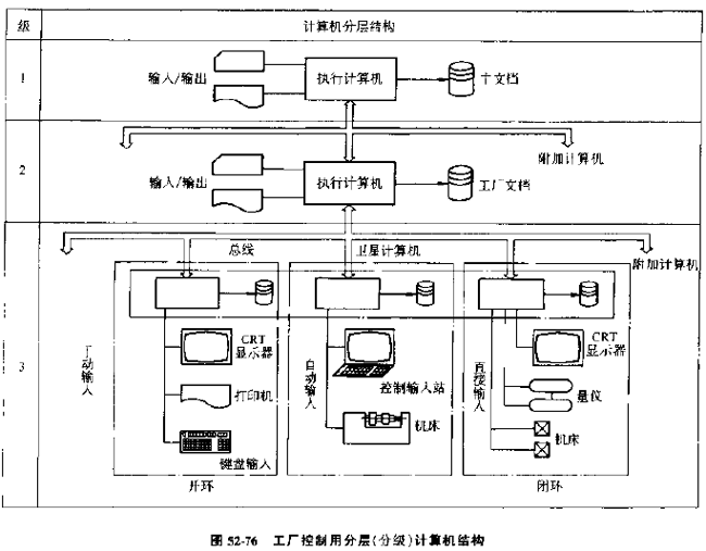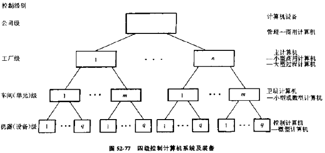 通常,柔性制造系統(tǒng)采取分層(級(jí))、分布式集中管理的控制結(jié)構(gòu),圖52-76表示了以多級(jí)計(jì)算機(jī)體系與結(jié)構(gòu)數(shù)據(jù)庫共享支撐下的分級(jí)管理塔。每一級(jí)計(jì)算機(jī)輔助一個(gè)相應(yīng)的管理層,計(jì)算機(jī)分為兩層或幾層,圖52-76為3級(jí)(層)計(jì)算機(jī)結(jié)構(gòu),圖52-77為4級(jí)計(jì)算機(jī)結(jié)構(gòu),一般公司級(jí)控制多用4級(jí)控制網(wǎng)絡(luò),工廠級(jí)控制多用3級(jí)分層控制網(wǎng)絡(luò)。對(duì)于柔性制造系統(tǒng),比較先進(jìn)的采用3級(jí)控制網(wǎng)絡(luò)。有時(shí)把計(jì)算機(jī)分層的級(jí)稱為控制級(jí)。