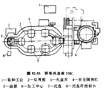 1) 環(huán)行托板庫FMC,如圖52-53所示,是由一臺加工中心和一座6位環(huán)形托板庫組成的FMC。六個托板庫可同時沿托板庫的長圓軌道運行,實現(xiàn)托板的輸送和定位。托板庫一端為工件裝卸工位,裝有工件的托板被運到機床前的工位停下,由交換裝置送上機床加工,加工后又通過此交換裝置將機床上的托板連同已加工完的工件送回托板庫,輸送到裝卸工位卸下。