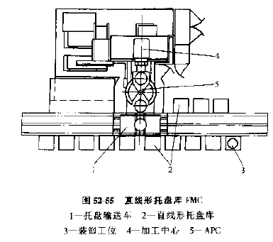 3) 直線形托板庫FMC,如圖52-55所示。相當于上述的圓形托板庫展成直線形,托板輸送裝置常為有軌小車,這種單元的優(yōu)點是具有擴展性,需要時可增加加工設備,加長運輸軌道和托板庫,擴展成更大的FMC或其他柔性制造系統(tǒng)。