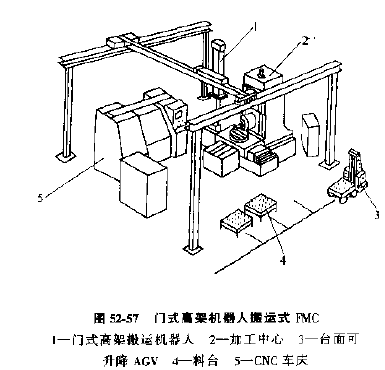 2) 龍門式機器人直接搬運的FMC(見圖52-57)其特點是,可搬運較大較重的零件和其他物料,搬運設備不占場地。