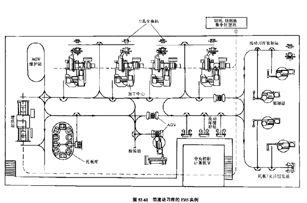 (2)帶流動(dòng)刀庫(kù)的FMS(見圖52-61)此系統(tǒng)的特點(diǎn)之一是,系統(tǒng)內(nèi)設(shè)有可更換的流動(dòng)刀庫(kù),流動(dòng)刀庫(kù)根據(jù)加工的需要在其裝卸站配備刀具,由小車AGV運(yùn)送并暫存在流動(dòng)刀庫(kù)緩存站,加工需要時(shí)送到機(jī)床邊的刀具交換站,與機(jī)床刀庫(kù)中的刀具更換。