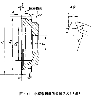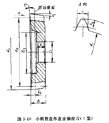 小模數(shù)直齒插齒刀,小模數(shù)直齒插齒刀已經(jīng)標(biāo)準(zhǔn)化,JB3095—82《小模數(shù)直齒插齒刀》中規(guī)定了盤形,碗形和錐柄三種型式的插齒機(jī)。盤形直齒插齒刀(Ⅰ型),其標(biāo)稱分度圓直徑為40,63mm兩種,精度等級分AA、A、B三種,其型式和尺寸見圖3-40和表3-93~表3-94。表3-97~表3-98。