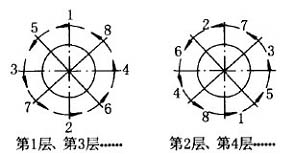 2 焊前準(zhǔn)備 (1)焊前轉(zhuǎn)軸表面應(yīng)仔細(xì)清理,嚴(yán)格清除一切會產(chǎn)生氫氣的油類等雜質(zhì)! (2)選用J857 焊條,φ3. 2mm。焊前將焊條在爐中250~300℃烘干2h,隨用隨取,消除焊條中的水分。 (3)在直流電焊機(jī)上采用反接法。3 焊補(bǔ)工藝 (1)將整個轉(zhuǎn)軸放進(jìn)烘爐預(yù)熱到300℃后取出! (2)將轉(zhuǎn)軸吊到滾輪支架上,滾輪應(yīng)支承于軸上φ135及φ140兩外圓處,裝上扳轉(zhuǎn)卡箍! (3)采用對稱交錯焊補(bǔ),每圈分8段,每層接頭收尾均應(yīng)錯開, 填滿弧坑, 電流值取90A~100A,慢焊速,以防止轉(zhuǎn)軸過熱,減小熔深和熱影響區(qū)。采用連續(xù)施焊,焊縫寬度應(yīng)大于6mm,高出轉(zhuǎn)軸表面2mm,第1層和第2層的焊接次序見圖2所示,第3層次序與第1層相同,第4層與第2層相同,其余類推。