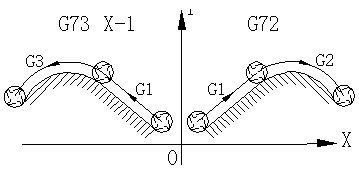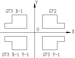 在數(shù)控加工程序代碼中,有個(gè)鏡像加工的指令。比如某型號(hào)加工中心的鏡像加工指令為G73(示意圖如圖1所示),其中設(shè)原加工圖形為第一象限的G72,使用G73 X-1指令后就可以加工出第二象限所示的圖形。也就是說將原程序段的加工代碼按Y軸或X軸(或XY混合)做軸向鏡像,當(dāng)要加工鏡像體時(shí)不需要另外編制程序,只需要將原程序代碼加以鏡像即可。