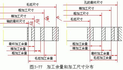 加工總余量也是個變動值,其值及公差一般可從有關手冊中查得或憑經(jīng)驗確定。如圖 3-77 表示了內(nèi)孔和外圓表面經(jīng)多次加工時,加工總余量、工序余量與加工尺寸的分布圖。