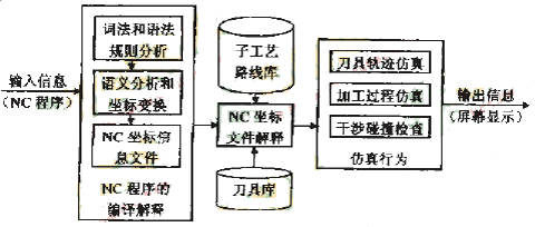 本文設(shè)計(jì)的數(shù)控車削仿真系統(tǒng)既可以對(duì)手工編制的單機(jī)數(shù)控車削程序進(jìn)行仿真,也可以作為CAD/CAPP/CAM集成制造系統(tǒng)中的一個(gè)子系統(tǒng),對(duì)集成制造系統(tǒng)自動(dòng)產(chǎn)生的數(shù)控車削程序進(jìn)行仿真。該系統(tǒng)可以完成對(duì)子程序的處理,允許運(yùn)動(dòng)坐標(biāo)的續(xù)效代碼和注釋行的存在,并且支持多種數(shù)控代碼格式,是一個(gè)通用的數(shù)控車削NC 程序仿真系統(tǒng),其工作流程如圖1所示。