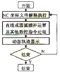 刀具軌跡動(dòng)態(tài)仿真是根據(jù)要進(jìn)行仿真的數(shù)控代碼,在計(jì)算機(jī)屏幕上動(dòng)態(tài)顯示刀具軌跡,以運(yùn)動(dòng)軌跡的方式來直觀顯示零件具體的加工過程;進(jìn)行刀具軌跡動(dòng)態(tài)仿真時(shí),順序讀入NC坐標(biāo)信息文件,獲取數(shù)控指令(直線、圓弧指令等)和命令參數(shù)(起點(diǎn)、終點(diǎn)和圓心坐標(biāo)等),然后執(zhí)行相應(yīng)的軌跡處理:對(duì)于直線和圓弧命令,則要根據(jù)其起止運(yùn)動(dòng)坐標(biāo),進(jìn)行直線和圓弧的插補(bǔ)運(yùn)算,得到運(yùn)動(dòng)過程中離散的中間點(diǎn)的坐標(biāo)值,然后動(dòng)態(tài)顯示刀具運(yùn)動(dòng)軌跡。刀具運(yùn)動(dòng)軌跡仿真算法流程如圖2所示。