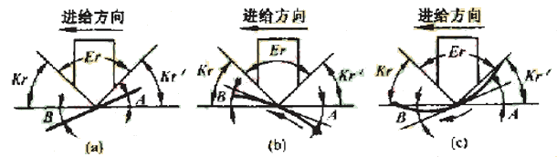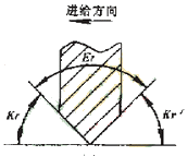 具體的干涉碰撞檢查算法,是在插值點(diǎn)將加工刀具的主偏角和副偏角與直線傾斜角度比較,對(duì)于圓弧段輪廓,則與該插值點(diǎn)在圓弧輪廓的切線的傾斜角進(jìn)行比較,并區(qū)分順圓和逆圓兩種情況。以右車刀切外輪廓為例,其對(duì)于直線和圓弧的干涉檢查如圖4所示。檢查結(jié)果將寫入一個(gè)干涉報(bào)告中,圖4中,kr為主偏角.kr'為副偏角,Er為刀尖角,A為與切削加工方向相反的傾斜角,B為與切削加工方向相同的傾斜角。當(dāng)A>kr時(shí),刀具副切削刃和零件表面發(fā)生干涉,當(dāng)180°+B<180°-kr時(shí),刀具的主切削刃和零件表面發(fā)生干涉,這時(shí)將發(fā)生過切現(xiàn)象二對(duì)于不同的加工方向和加工輪廓,上述判別式應(yīng)進(jìn)行相應(yīng)的調(diào)整。