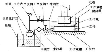 混粉鏡面電火花加工是近年來發(fā)展起來的一種改善大面積電火花加工表面粗糙度的先進(jìn)技術(shù),所謂混料鏡面電火花加工即是在工作液中添加了微粉,譬如,硅粉、鋁粉、鉻粉,以及有關(guān)添加劑,以期使加工表面獲得鏡面效果。日本最早進(jìn)行了研究,并取得了較好的效果。國內(nèi)起步較晚,哈爾濱工業(yè)大學(xué)特種加工所近來也進(jìn)行了這一領(lǐng)域的研究。由于在工作液中混入了微粉,因此不能用電火花機(jī)床原有的工作液循環(huán)裝置。我們?cè)谇捌诘脑囼?yàn)中應(yīng)用簡(jiǎn)易工作液循環(huán)裝置發(fā)現(xiàn)存在如下問題:(1)加工中混在工作液中的粉末有較嚴(yán)重的沉積的現(xiàn)象,影響了電極與工件的正常放電;(2)粉末在工作液中分布的均勻性也不理想,影響了放電的分散性,不利于提高工件的表面粗糙度;(3)沖油控制不便。因此需要重新設(shè)計(jì)工作液循環(huán)裝置。