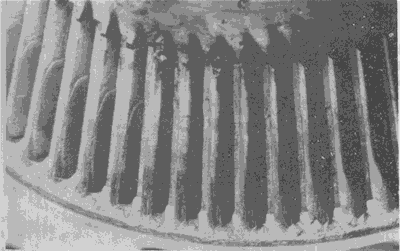 高速運(yùn)轉(zhuǎn)齒輪齒面頂部的沖蝕,其部位與潤(rùn)滑劑噴嘴的方向一致。