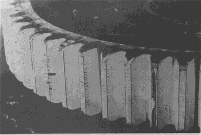 輪齒的滾壓塑變。圖為一從動(dòng)齒輪,其齒面上工作節(jié)曲面附近明顯的隆起清晰可見。