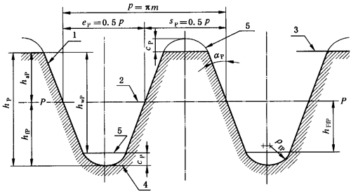 1- 標(biāo)準(zhǔn)基本齒條齒廓;2-基準(zhǔn)線;3-齒頂線;4-齒根線;5-相嚙標(biāo)準(zhǔn)基本齒條齒廓