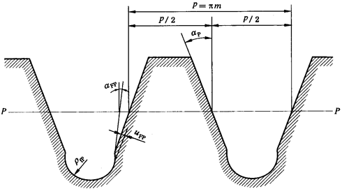 注:標(biāo)準(zhǔn)基本齒條齒廓的輪齒介于齒頂處的齒頂線和與之平行的齒底部的齒根線之間。齒廓直線部分和齒根線之間的圓角是半徑為ρfP的圓弧。