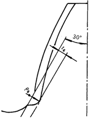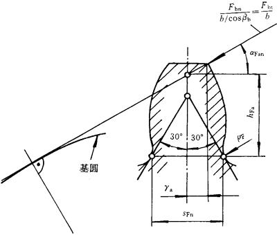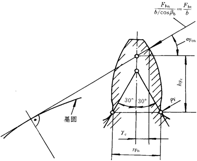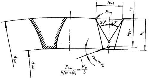 ρF——30°切線切點處曲率半徑。外齒輪由式(182)計算,內(nèi)齒輪由式(195)計算。