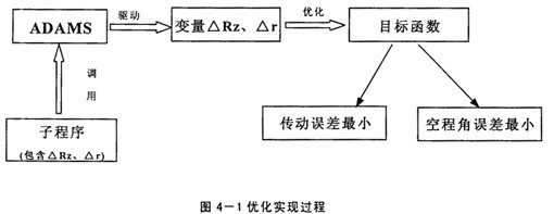上已述及,擺線輪修形方式及修形量的選擇對(duì)RV減速器傳動(dòng)誤差及空程角誤差的影響很大,因此進(jìn)行優(yōu)化分析應(yīng)將傳動(dòng)誤差及空程角誤差作為目標(biāo)函數(shù),而將移距修形量△Rz及等距修形量△r作為設(shè)計(jì)變量,且△Rz與△r的正、負(fù)號(hào)表明了修形方式,子程序又是建立擺線輪的通用齒廓方程,通過ADAMS對(duì)子程序的調(diào)用,就可得到最優(yōu)的修形組合。具體的實(shí)現(xiàn)過程如下圖所示: