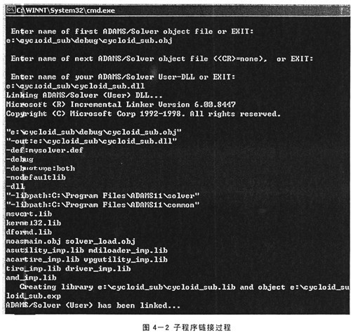 5)在背景模式(即命令提示模式)下,將上一步的目標(biāo)文件與ADAMS鏈接,生成可執(zhí)行的用戶庫(*.dll)。