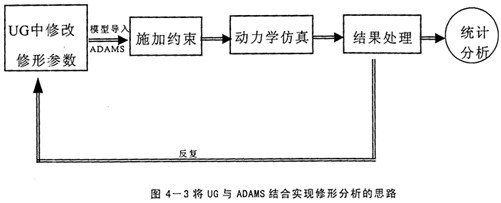 前面已經(jīng)以擺線傳輸線的參數(shù)化建模為例,闡述了UG的強(qiáng)大的基于特征的參數(shù)化造型功能,既然用子程序的方式實(shí)現(xiàn)不了,將UG的該功能加以充分利用,也可以實(shí)現(xiàn)優(yōu)化修形的目的。實(shí)現(xiàn)的途徑是在建造擺線輪的表達(dá)式中考慮修形量△Rz與△r,這樣就建造了修形后的擺線輪,同時(shí)△Rz與△r是隨機(jī)可調(diào)的變量,可以得到任意組合的修形方式。并且UG的數(shù)據(jù)存儲(chǔ)具有單一數(shù)據(jù)庫的特點(diǎn),零件圖中修改后,裝配圖及工程圖全都自動(dòng)更新,不用人工去費(fèi)時(shí)修改。然后,再將總裝配模型導(dǎo)入到ADAMS中施加約束。執(zhí)行仿真。這樣就得到多組修形組合的仿真結(jié)果,經(jīng)過統(tǒng)計(jì)分析就可得到最佳的修形組合。具體思路如下圖所示。