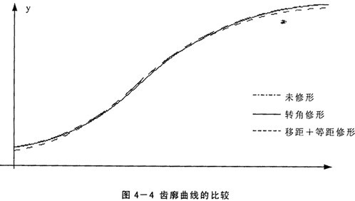 采用這種方法加工擺線輪時(shí),磨齒機(jī)的調(diào)整和加工標(biāo)準(zhǔn)齒廓時(shí)相同,只是在磨出標(biāo)準(zhǔn)齒廓以后,將分齒機(jī)構(gòu)和偏心機(jī)構(gòu)的聯(lián)系脫開,然后撥動(dòng)分齒掛輪上的齒輪,使工作臺(tái)轉(zhuǎn)過一微小的角度δ,從而改變了擺線輪在上一次磨削時(shí)的初始位置。這樣重新磨削后,就得到一條與標(biāo)準(zhǔn)齒廓基本上一樣的齒廓,僅整個(gè)輪齒變瘦一些,而齒間變大一些;其特點(diǎn)是同時(shí)嚙合齒數(shù)較多,但擺線輪的齒頂和齒根圓直徑?jīng)]有變化,該處與針齒相嚙合時(shí)沒有間隙存在,因此不能單獨(dú)使用轉(zhuǎn)角修形法。
