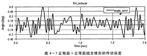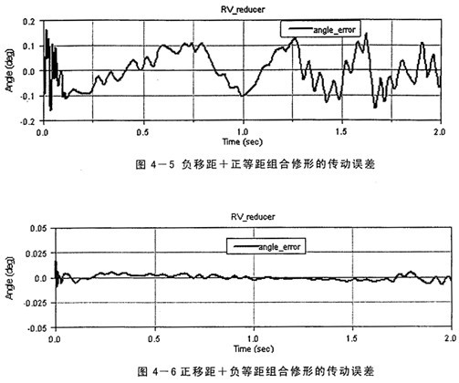 其中,θer一一角度運(yùn)動(dòng)誤差,一一任意時(shí)刻輸入軸轉(zhuǎn)角,i一一傳動(dòng)比,θout一一輸出軸轉(zhuǎn)角。由于加工誤差、輪齒修形的原因引起瞬時(shí)傳動(dòng)比的變化,必然出現(xiàn)傳動(dòng)誤差,產(chǎn)生運(yùn)動(dòng)的不平穩(wěn)性。在RV減速器中,漸開線齒輪嚙合在前級(jí),后級(jí)是擺線針輪傳動(dòng),由于后級(jí)的傳動(dòng)比一般約是前級(jí)的4~30倍,前級(jí)的漸開線齒輪的傳動(dòng)誤差將被縮小同樣的倍數(shù)后輸出,所以其傳動(dòng)誤差關(guān)鍵取決于后級(jí)的擺線針輪的嚙合誤差,而實(shí)際工作中擺線輪的修形方式及修形量的選擇是影響擺線針輪的嚙合誤差很大的因素。因此本課題中僅研究了輪齒修形對(duì)傳動(dòng)誤差的影響,所采用的修形量以及得到的傳動(dòng)誤差大小如表4-1所示,限于篇幅,對(duì)于負(fù)移距+正等距、正移距+負(fù)等距和正移距+正等距組合修形的傳動(dòng)誤差仿真結(jié)果曲線各只列出一組(圖4-5、4-6、4-7)。