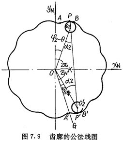 如圖7.9所示,AB是其中一個(gè)齒槽的一側(cè)齒廓,A′B′是跨教為K(圖中K=5)的一個(gè)齒槽的另一側(cè)齒廓。設(shè)內(nèi)齒圈的齒廓曲線在圖示坐標(biāo)系下可用方程式(7.9)來(lái)表示,現(xiàn)在來(lái)求齒廓AB及齒廓A′B′上具有的公法線。